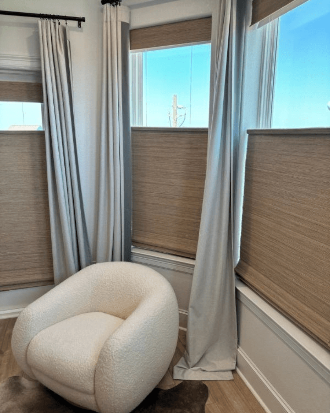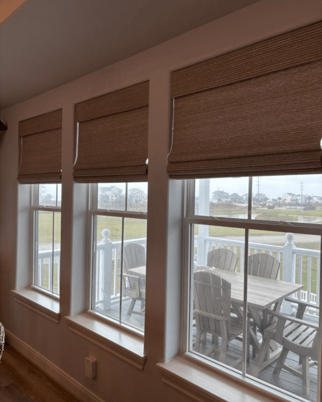 Woven wood Roman shades offer more than just looks. They help insulate your windows, block UV rays, and keep your rooms comfortable year-round. They're also moisture-resistant and easy to clean. Order your free in-home estimate at www.taylormadeshutters.com. #UVProtection #MoistureResistantShades #AllSeasonComfort #WindowFunction #TaylorMadeBlinds
